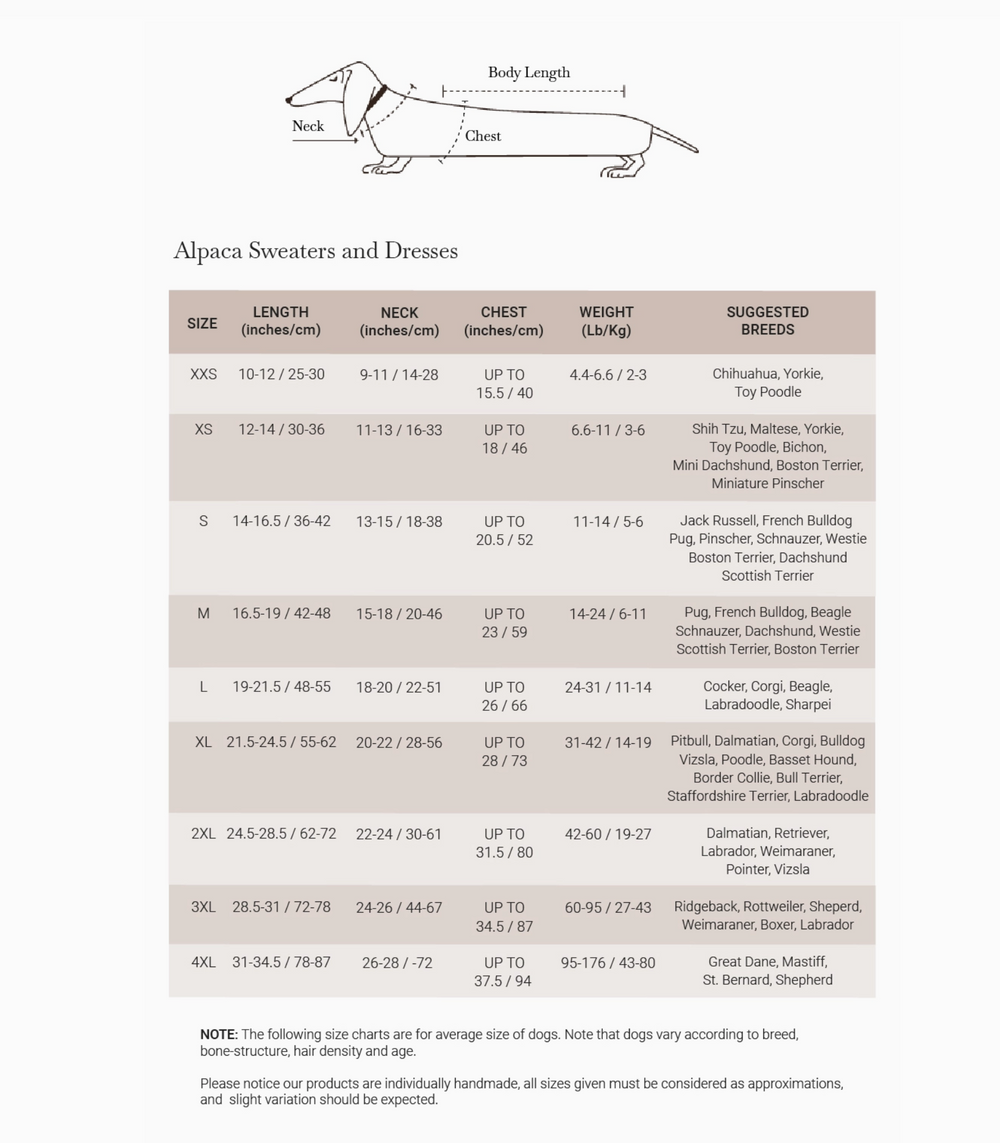 The Camel Aran Diamond Knit Alpaca Wool Dog Sweater offers understated elegance. Crafted from alpaca wool, it's soft, cozy, and stylish, perfect for any occasion. Give your pet a touch of timeless charm with the Camel Aran Alpaca Wool Dog Sweater. Made from high-quality alpaca wool for comfort and warmth. Handmade from alpaca fibers. Soft and warm to the touch. Non-itchy & hypoallergenic. Leash opening - Oscar is a Miniature Dachshund who wears a size Small. This garment is designed with your pet's well-being in mind. About the sizing (Size guide in photo gallery) To calculate your dog's size, you need to measure the length of your dog from the base of the neck to the base of the tail, which is the primary measurement in our garments. The neck measurement, as well as the breed guide in the sizing chart, will help ensure you choose the right size for your dog in the specific product style you desire.