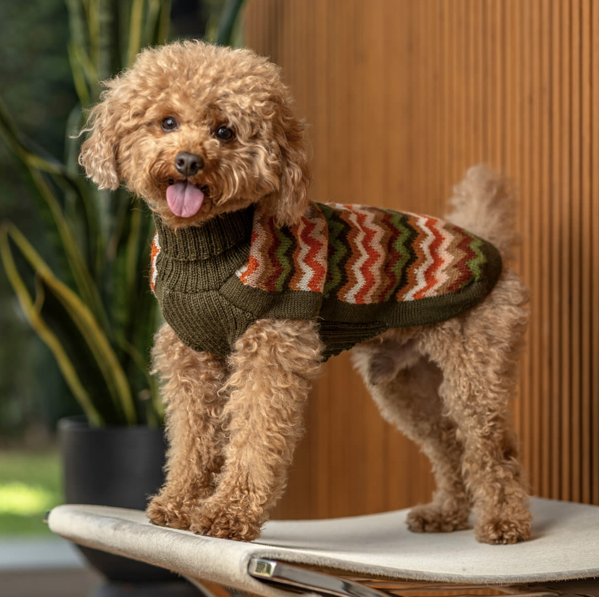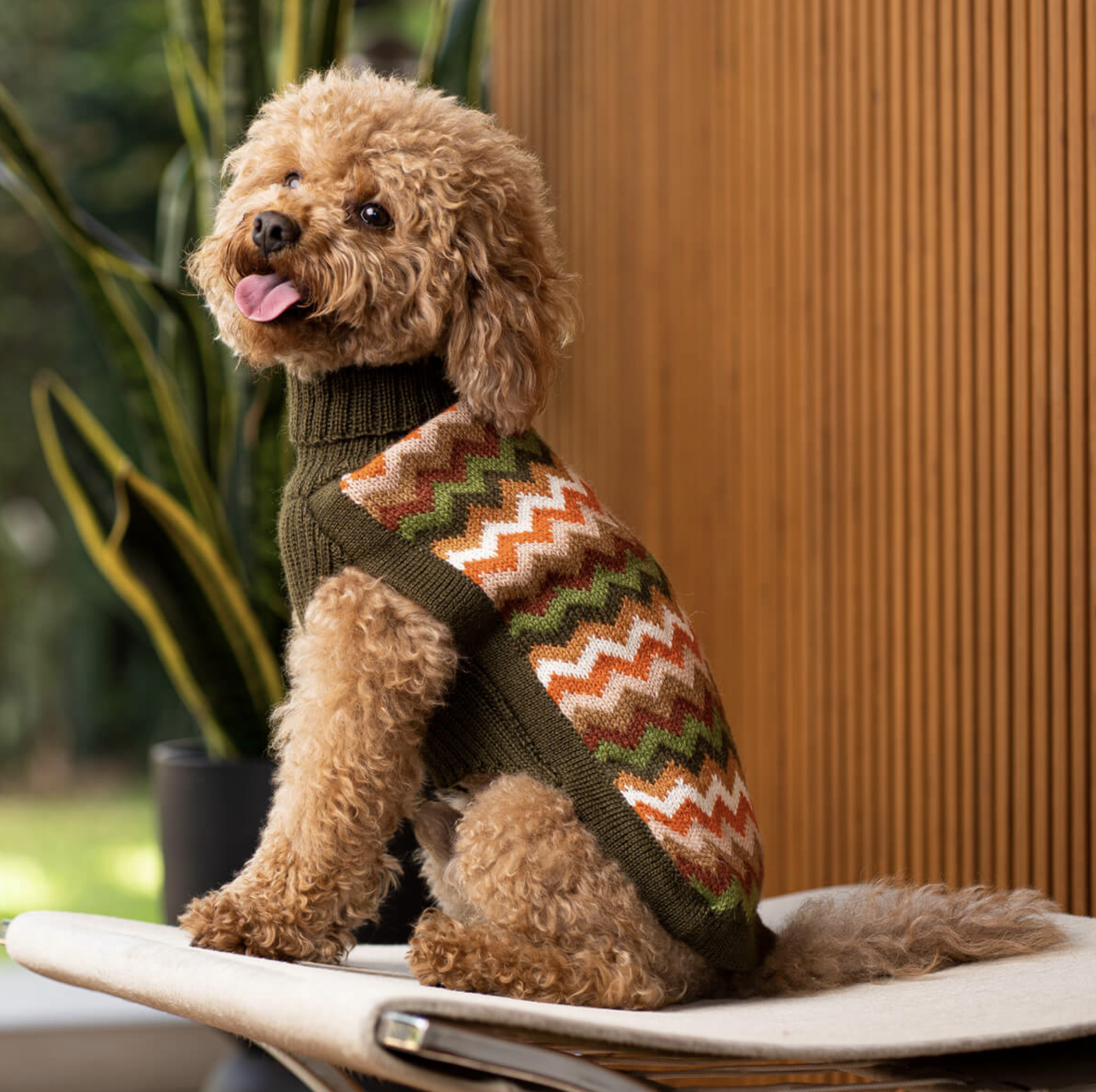 Inspired by forest floors and flickering leaves, the Forest Chevron Knit Alpaca Dog Sweater pairs a dynamic zigzag pattern with deep, earthy greens. A cozy layer for pups who chase leaves and turn heads.