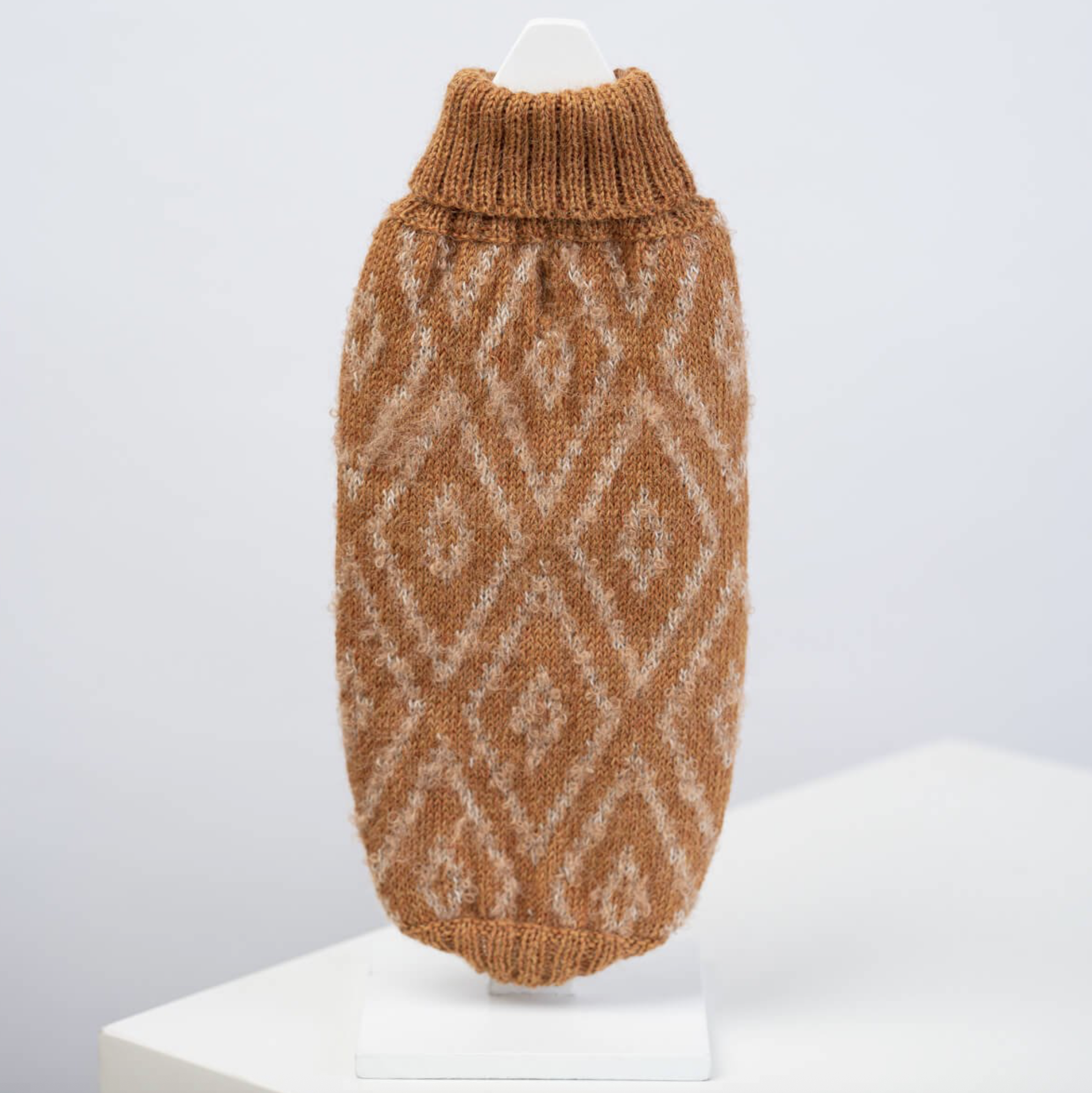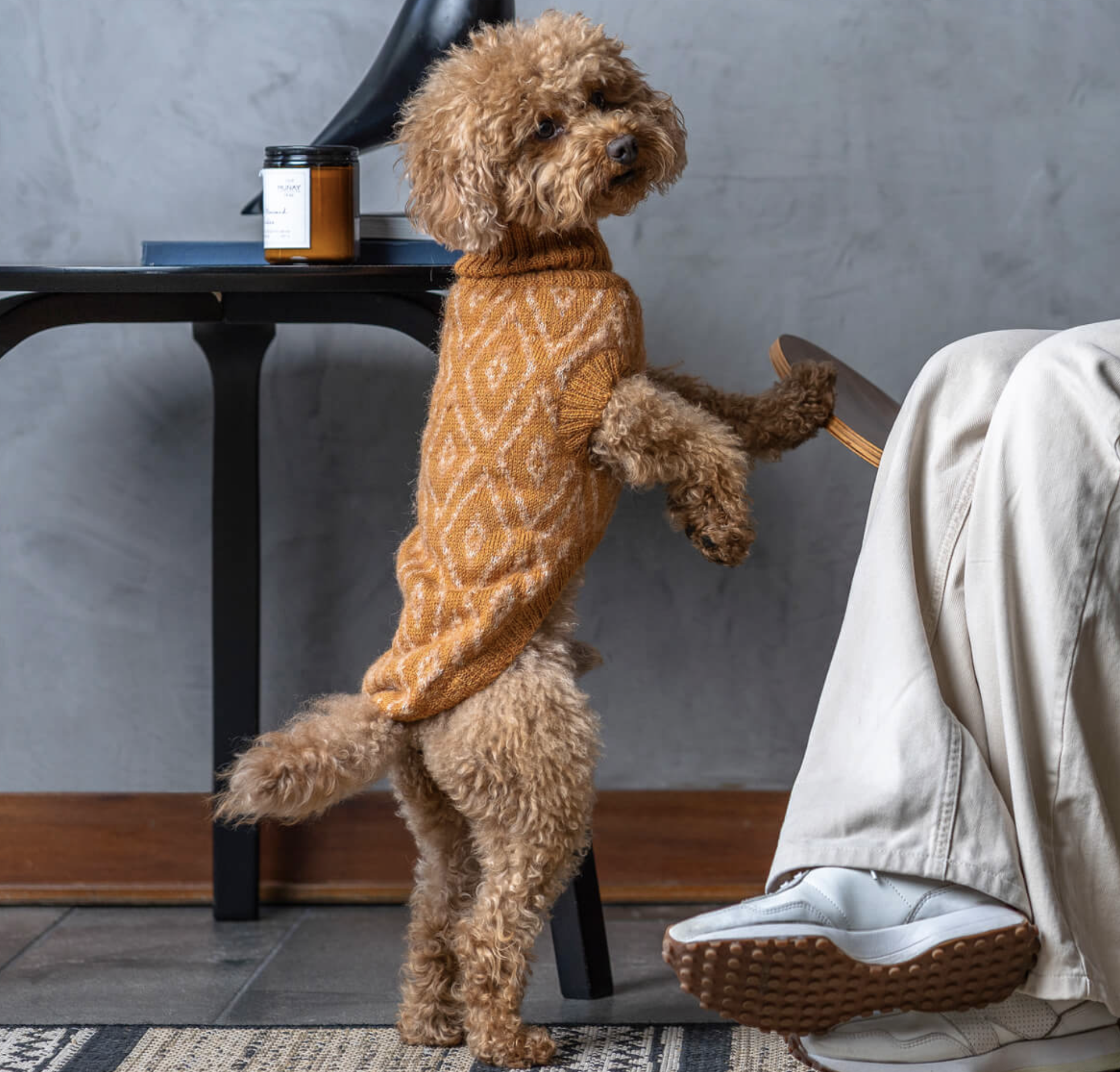 The Golden Ochre Alpaca Dog Sweater is crafted in a soft, earthy hue, with a diamond knit that plays with texture and form. Subtle, thoughtful, and timeless, it’s for pups whose quiet style leaves a lasting impression. Designed with a slimmer fit, ideal for leaner dogs.